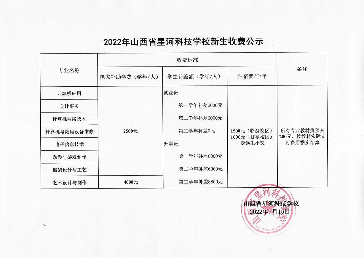 2022年山西省星河科技学校收费标准公示
