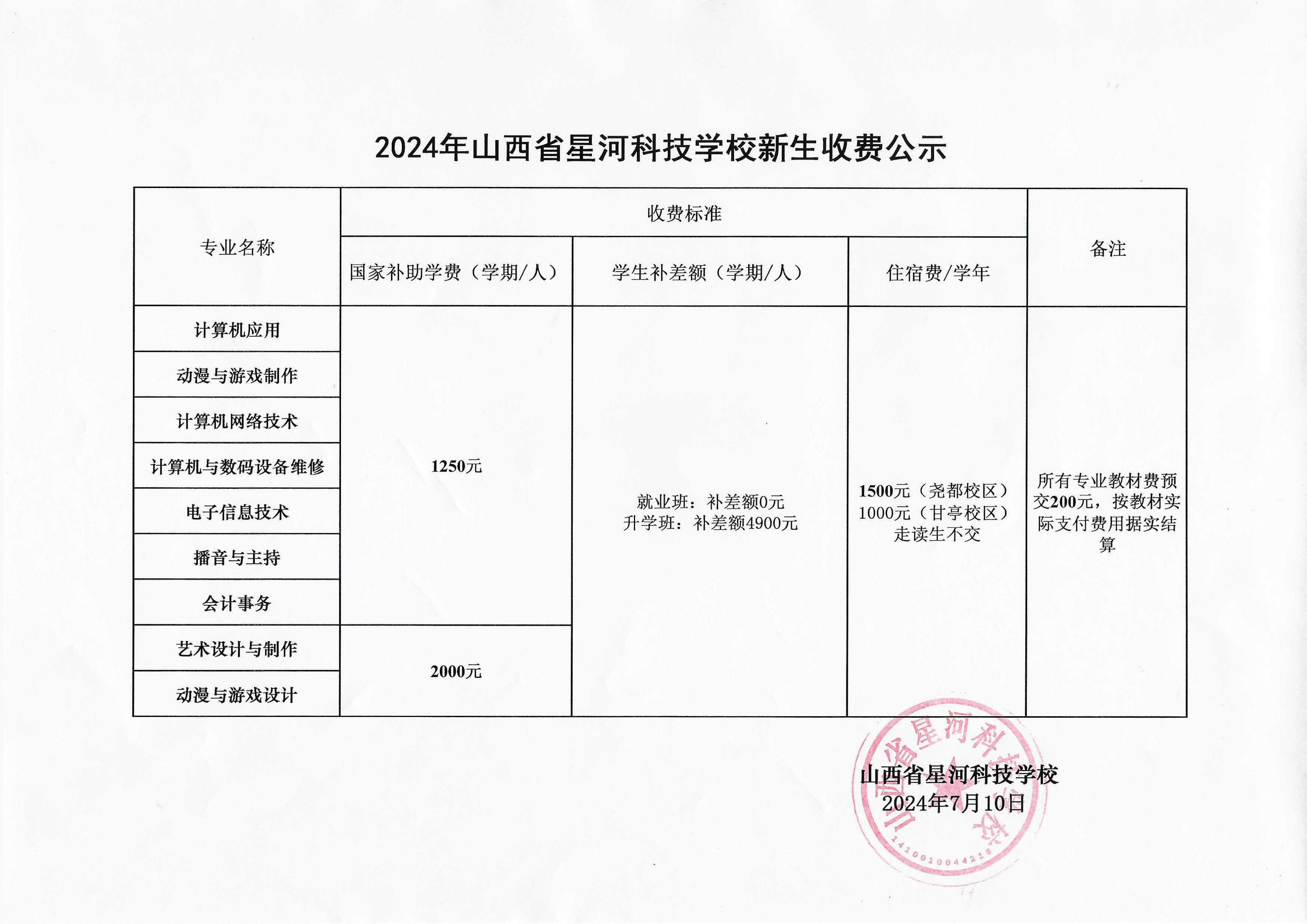 山西省星河科技学校2024年新生收费标准